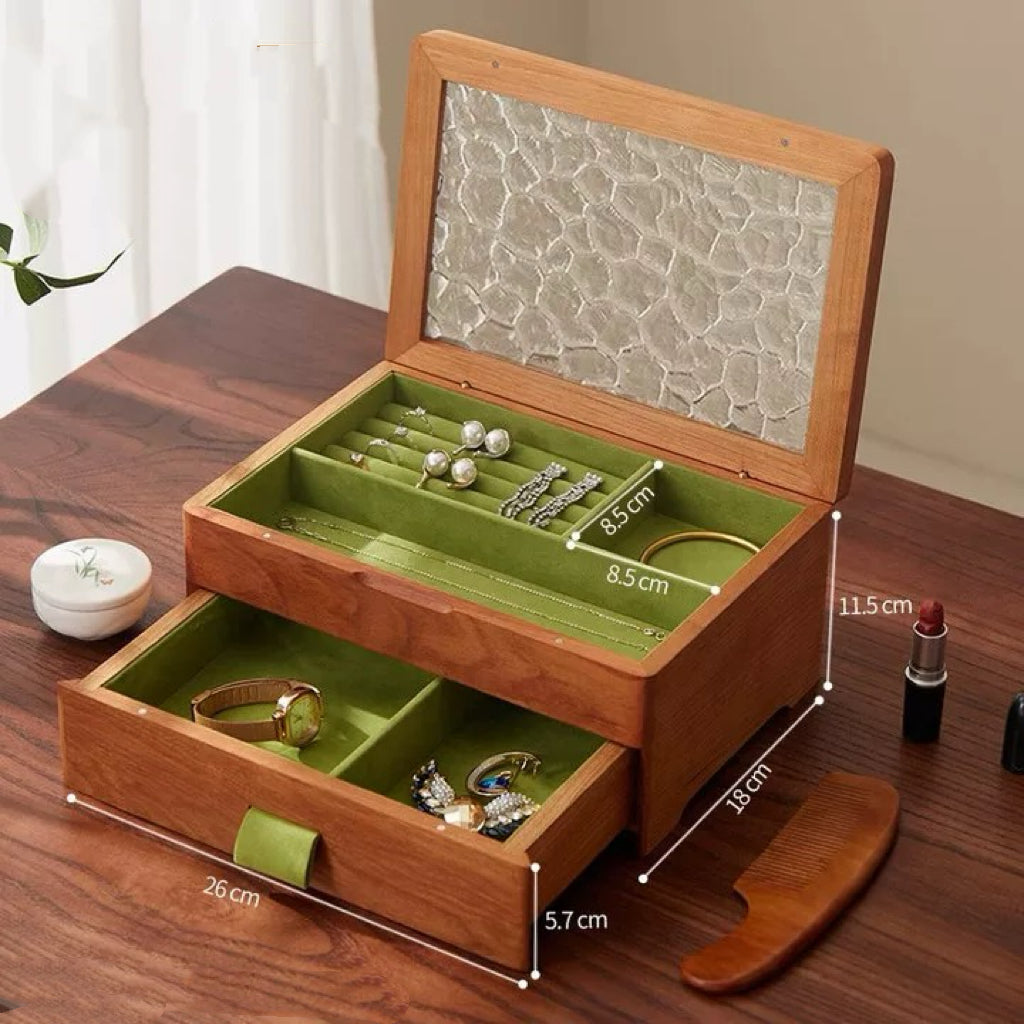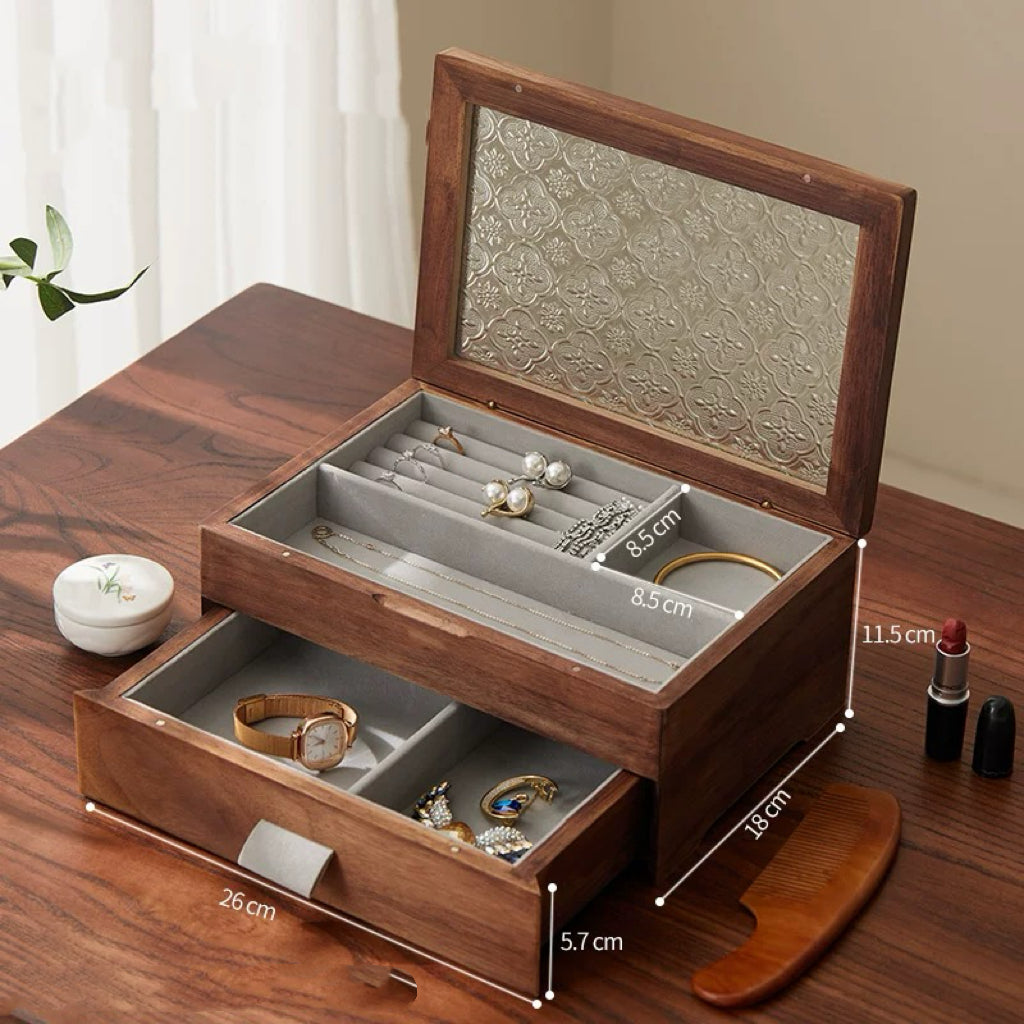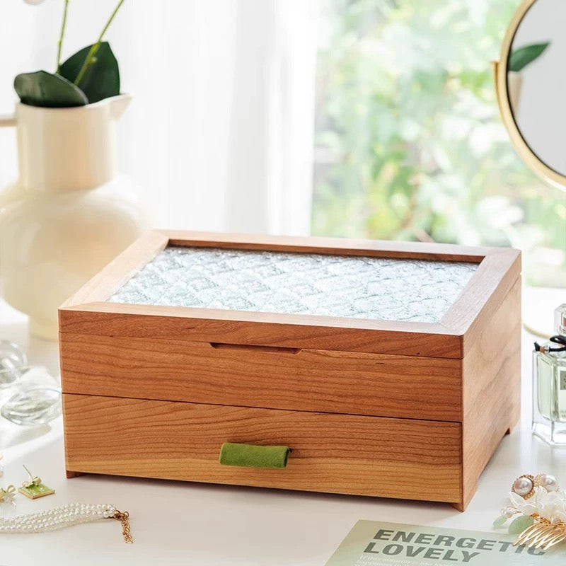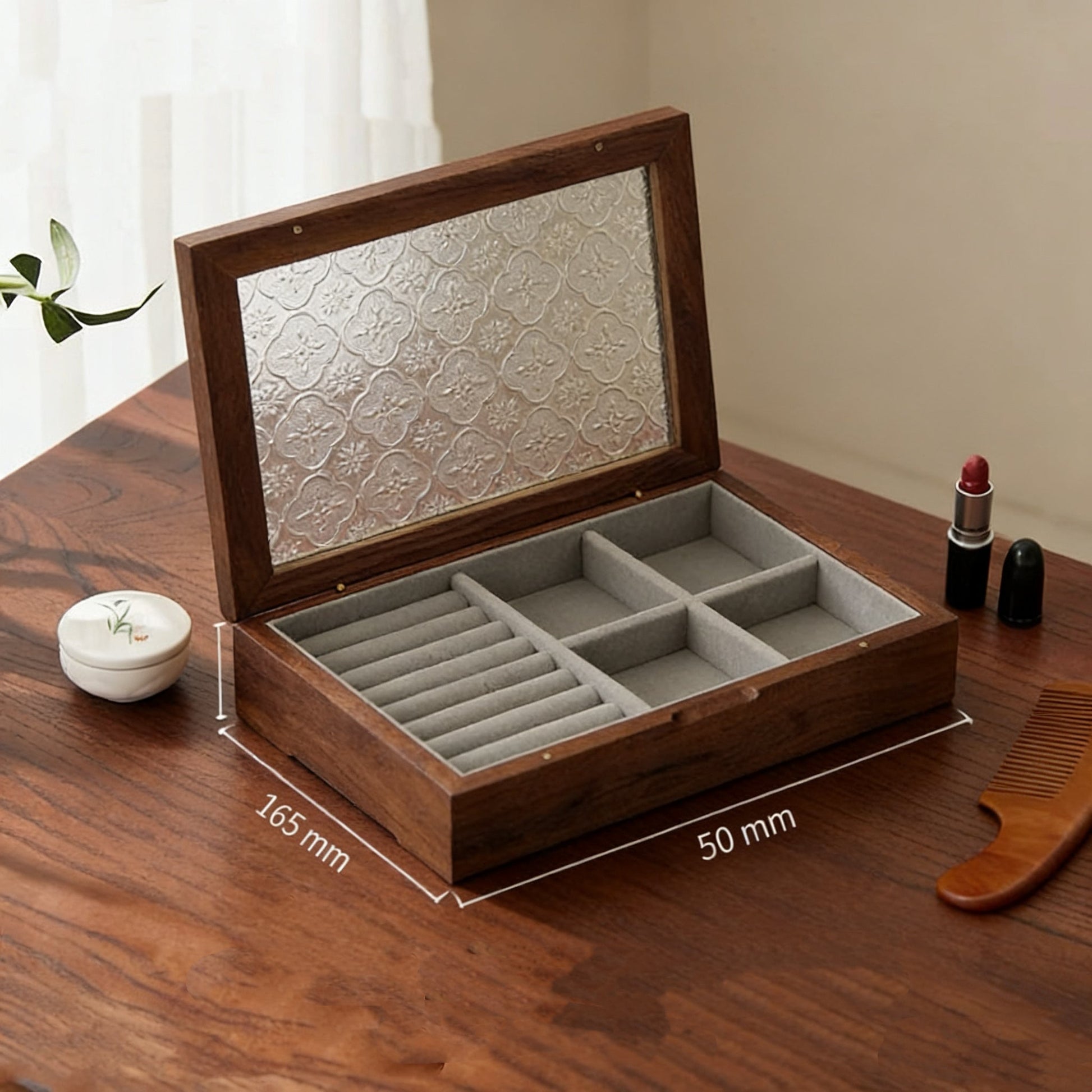 • Materials: Solid Wood, Textured Glass Lid, Soft Lined Interior