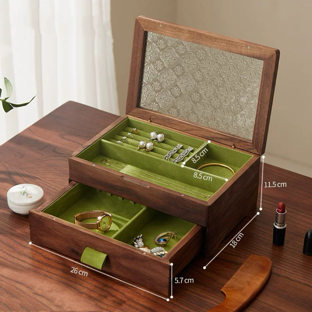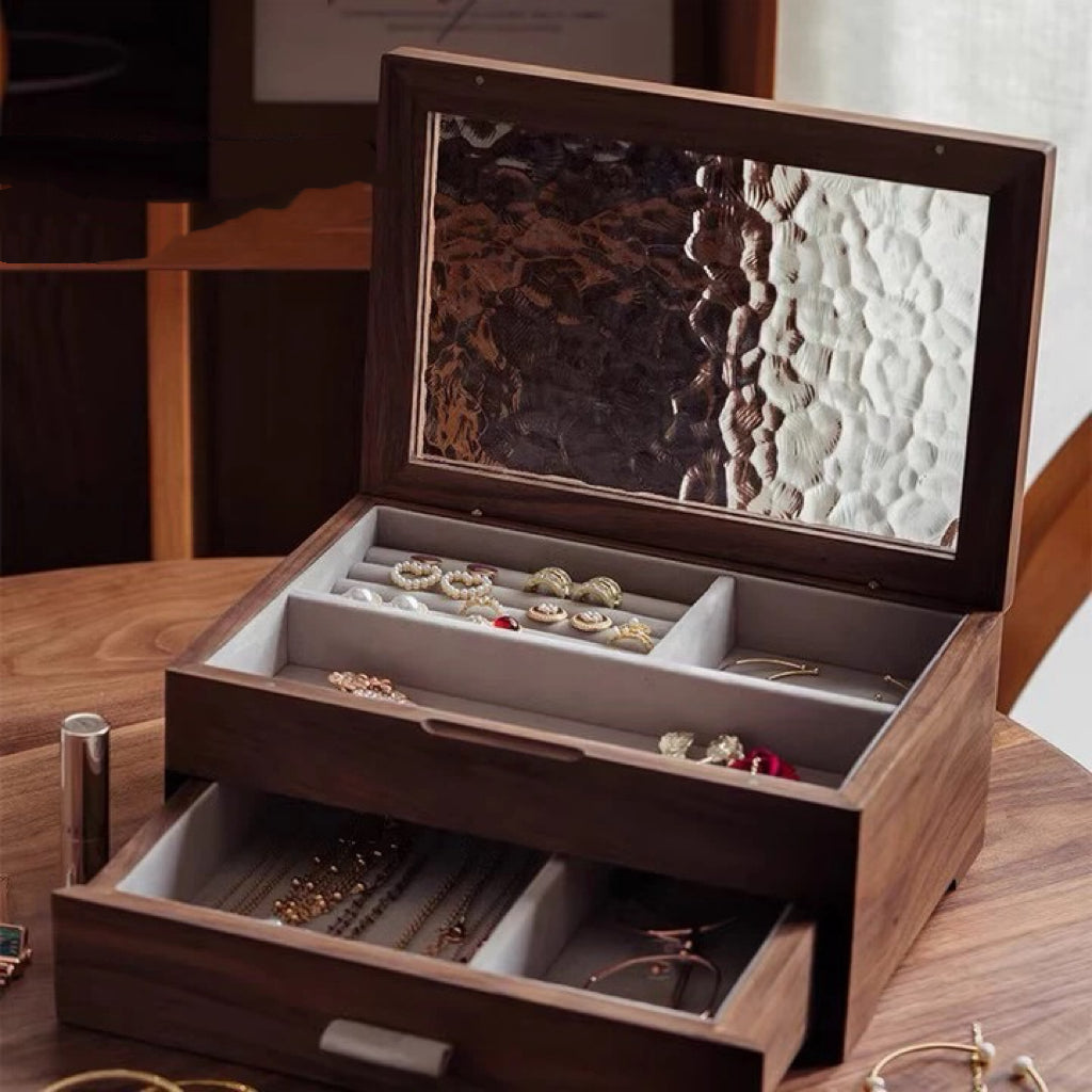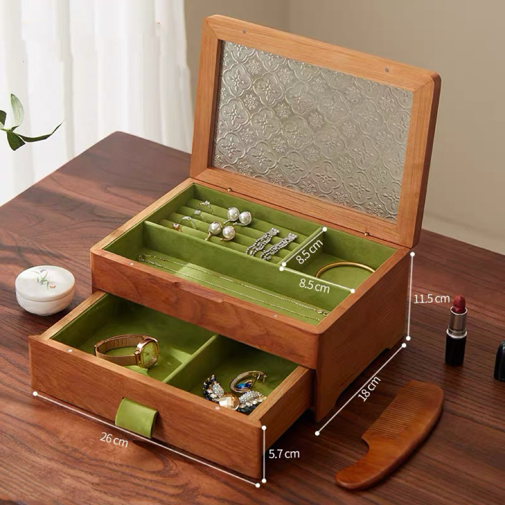 • Materials: Solid Wood, Textured Glass Lid, Soft Lined Interior