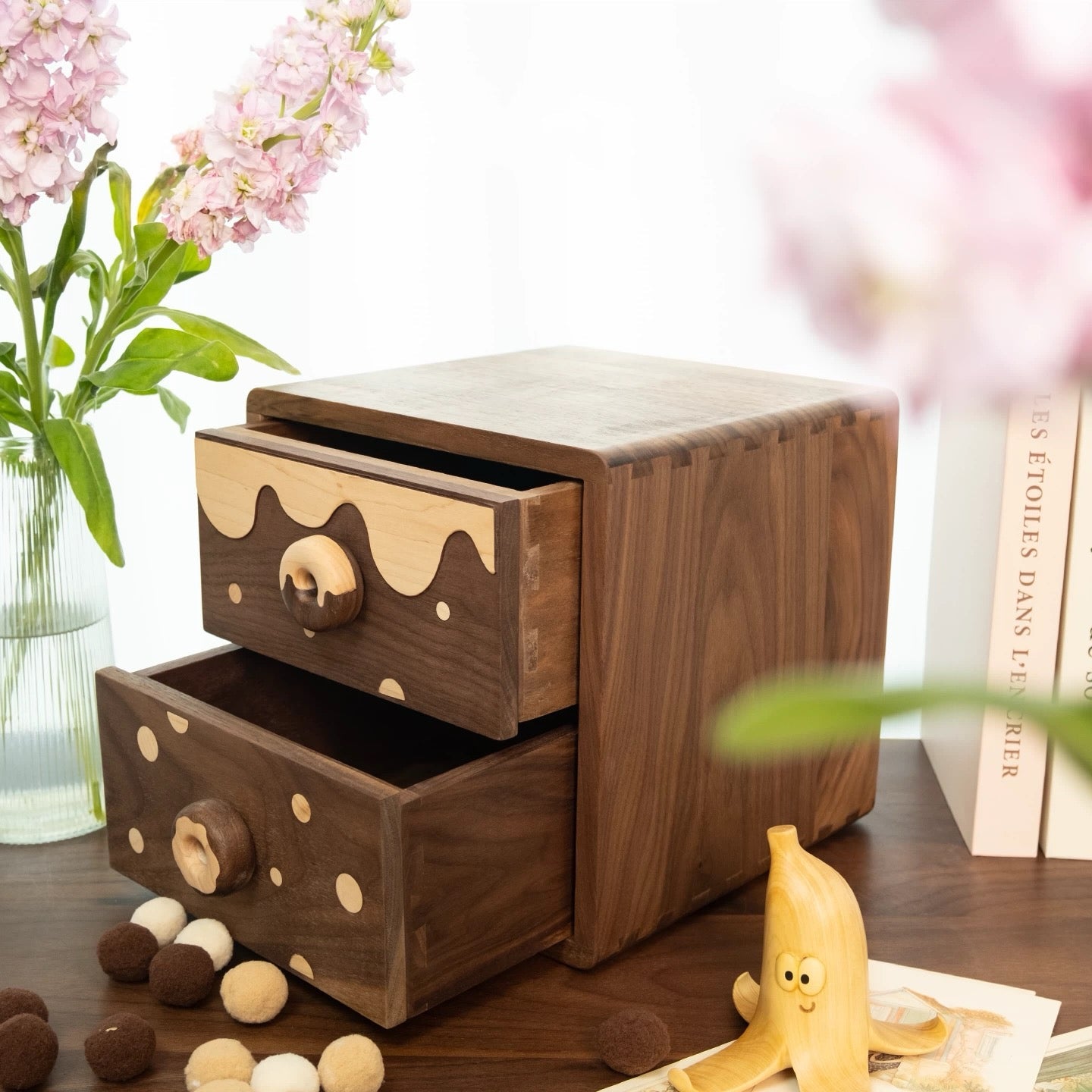 Nooki combines solid wood craftsmanship with a two-drawer layout, offering an organized home for jewelry, accessories, and desktop items while adding a warm, storybook accent to your space.