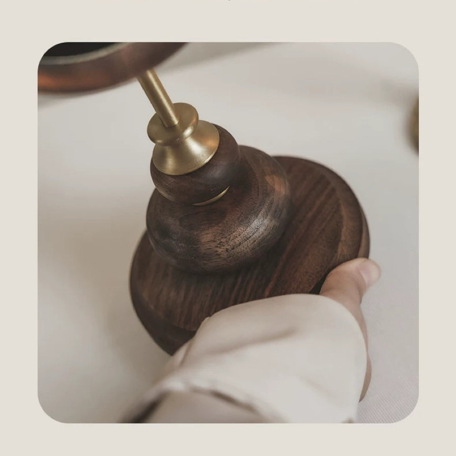 Defined by a classic round silhouette, this tabletop mirror pairs solid black walnut with warm brass detailing. Thoughtfully proportioned and softly adjustable, it brings balance, clarity, and timeless character to daily rituals.