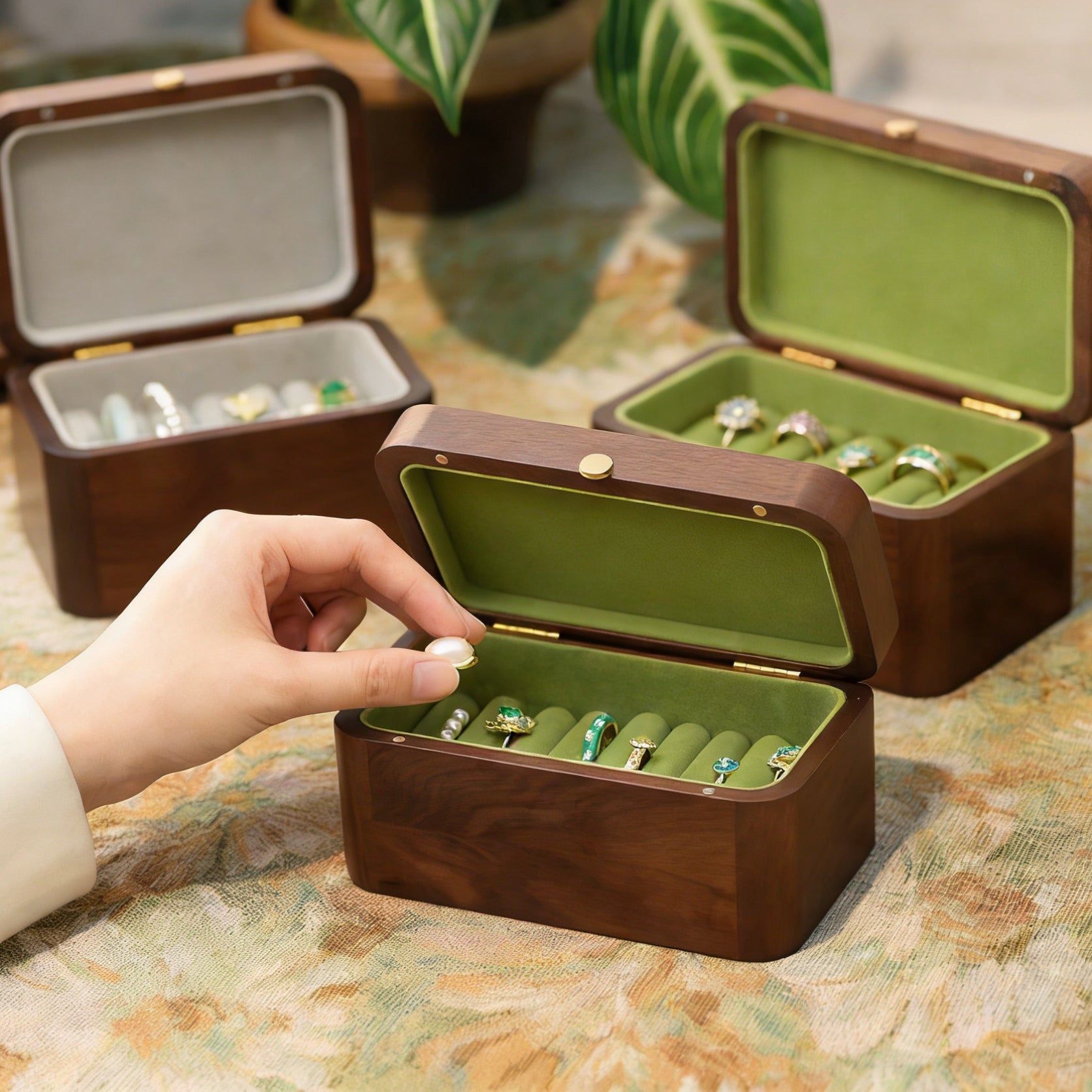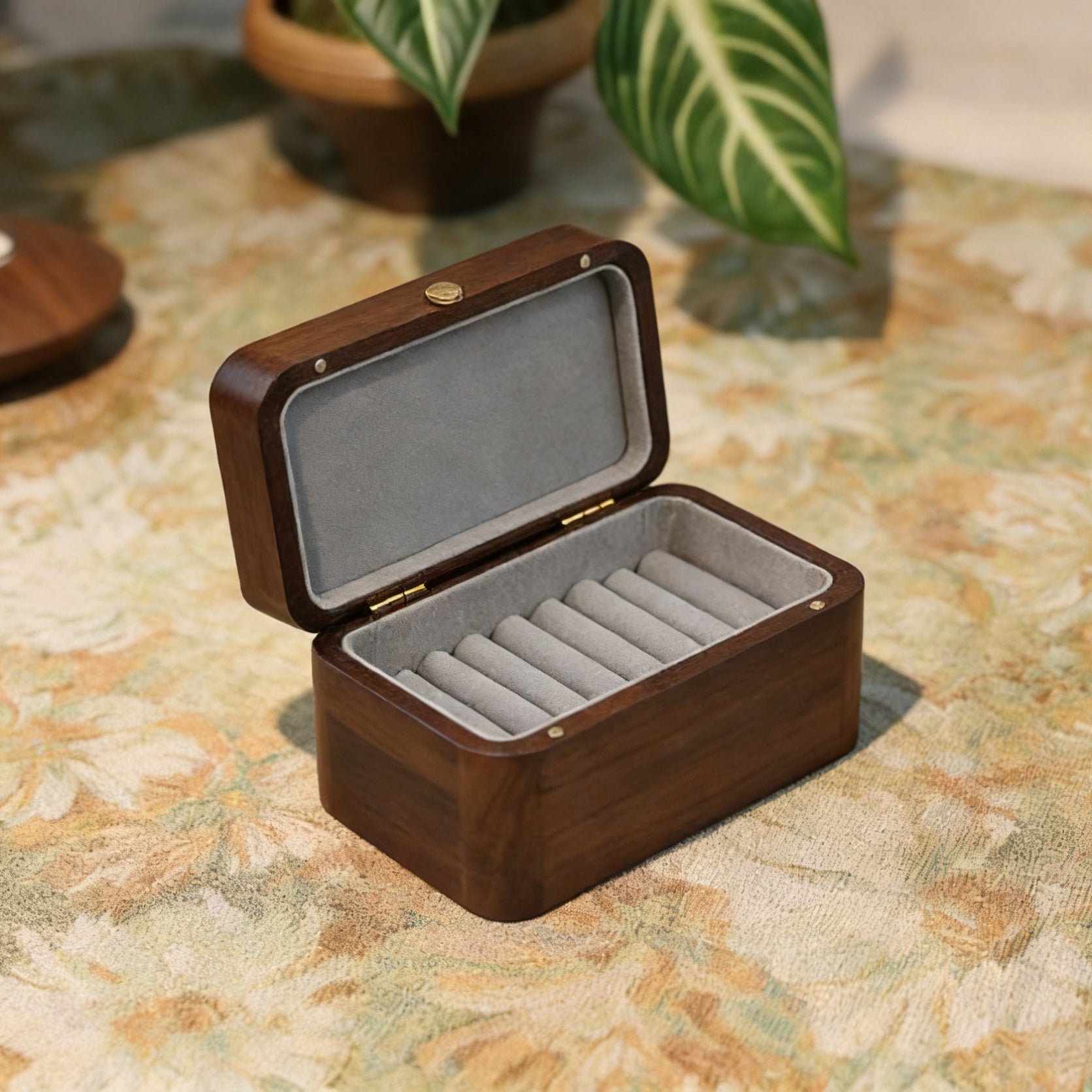 Solid walnut paired with a patterned glass lid—warm, nostalgic, and quietly refined.